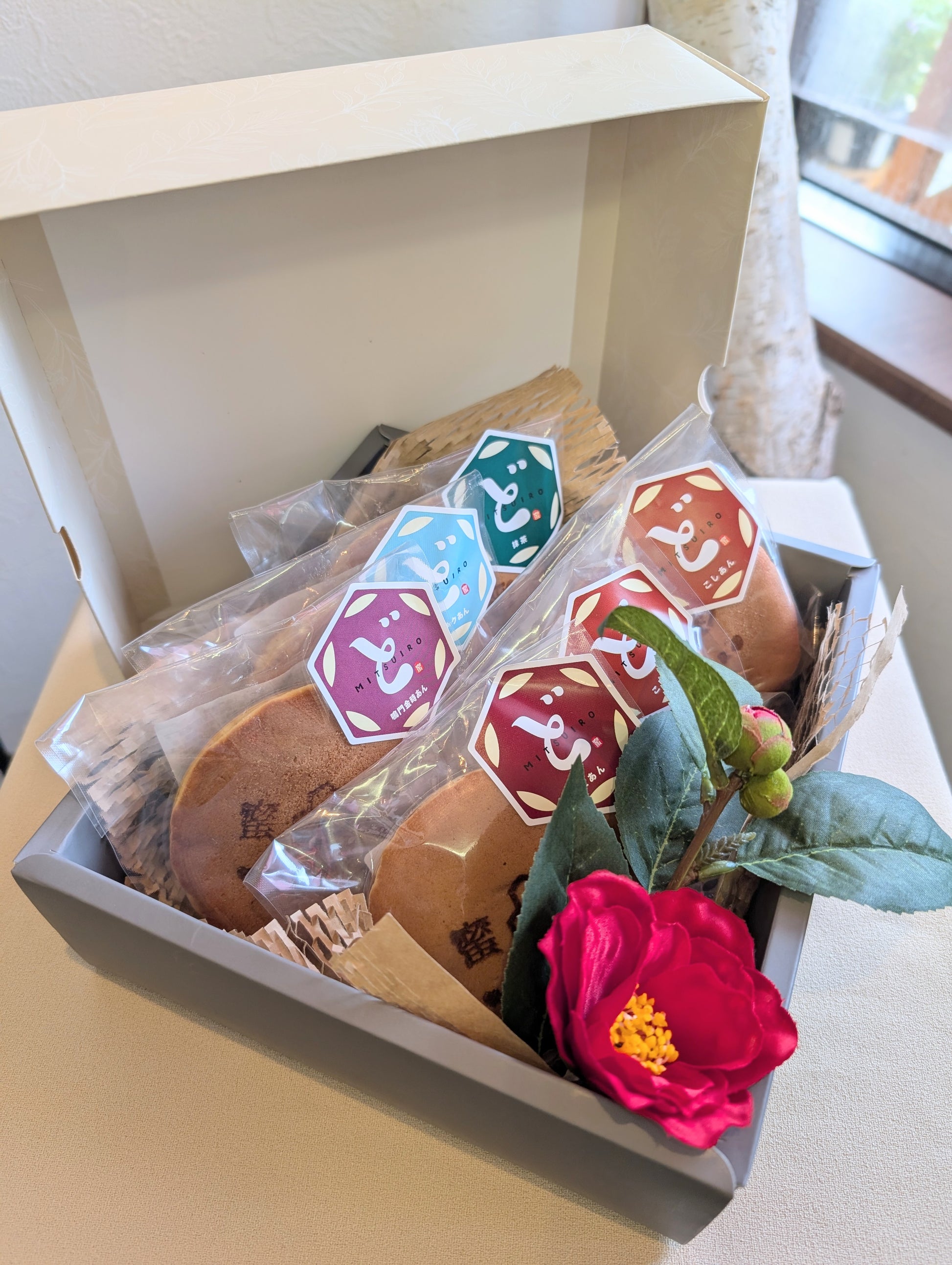 蜜彩どら焼き6ヶBOX入りです。粒あん、こしあん、鳴門金時あん、うぐいすあんからのおまかせとなっております。