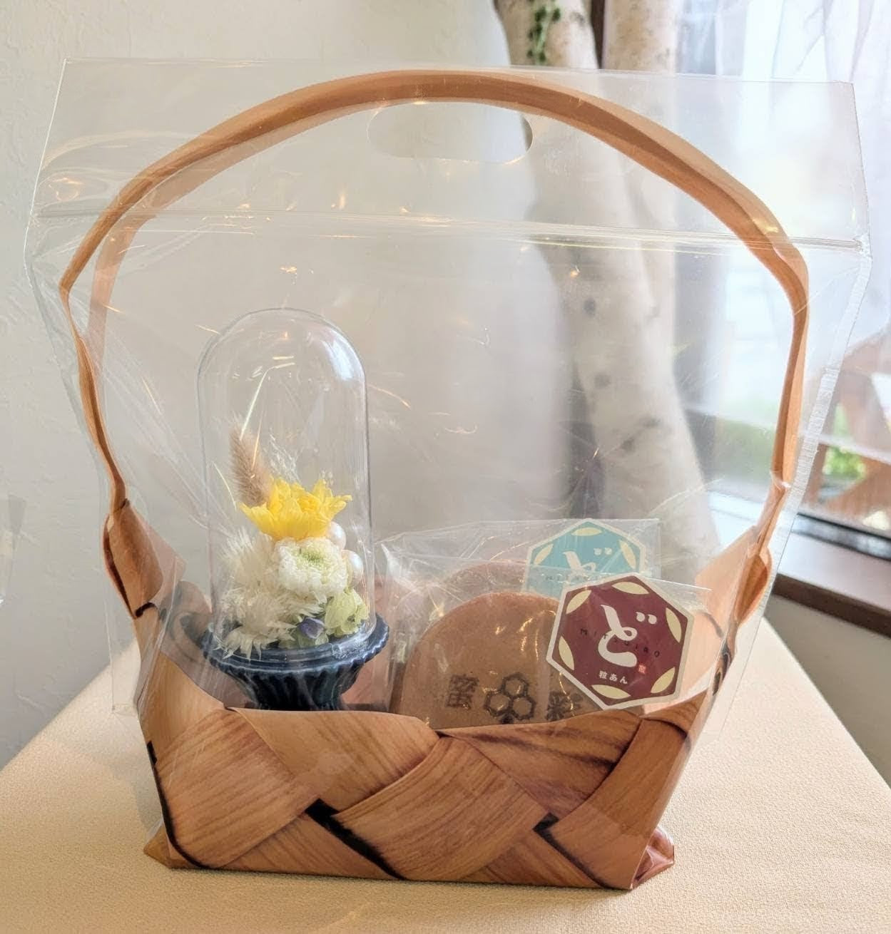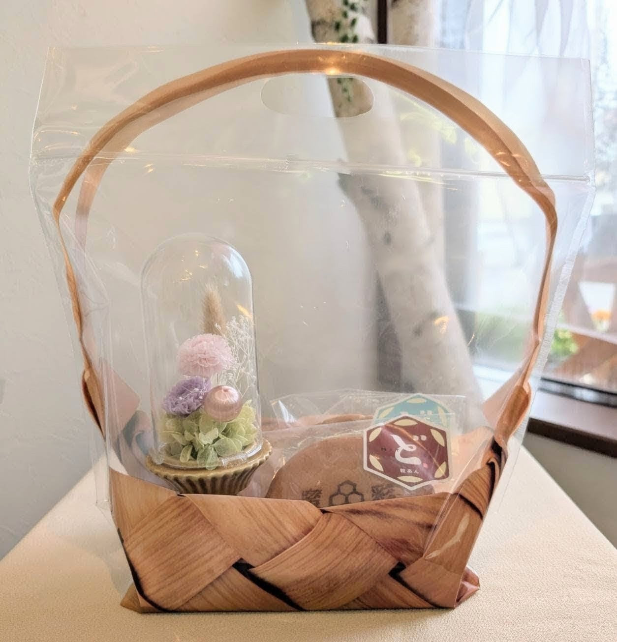 ガラスドームに入ったプリザーブドフラワーと蜜彩のどら焼きのセット。
