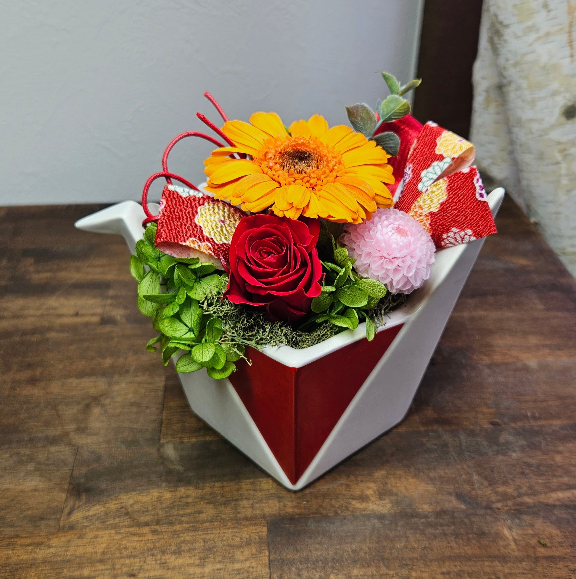 オリヅルをモチーフにした陶器の器に暖色系のお花を使った、和風のアレンジメント。