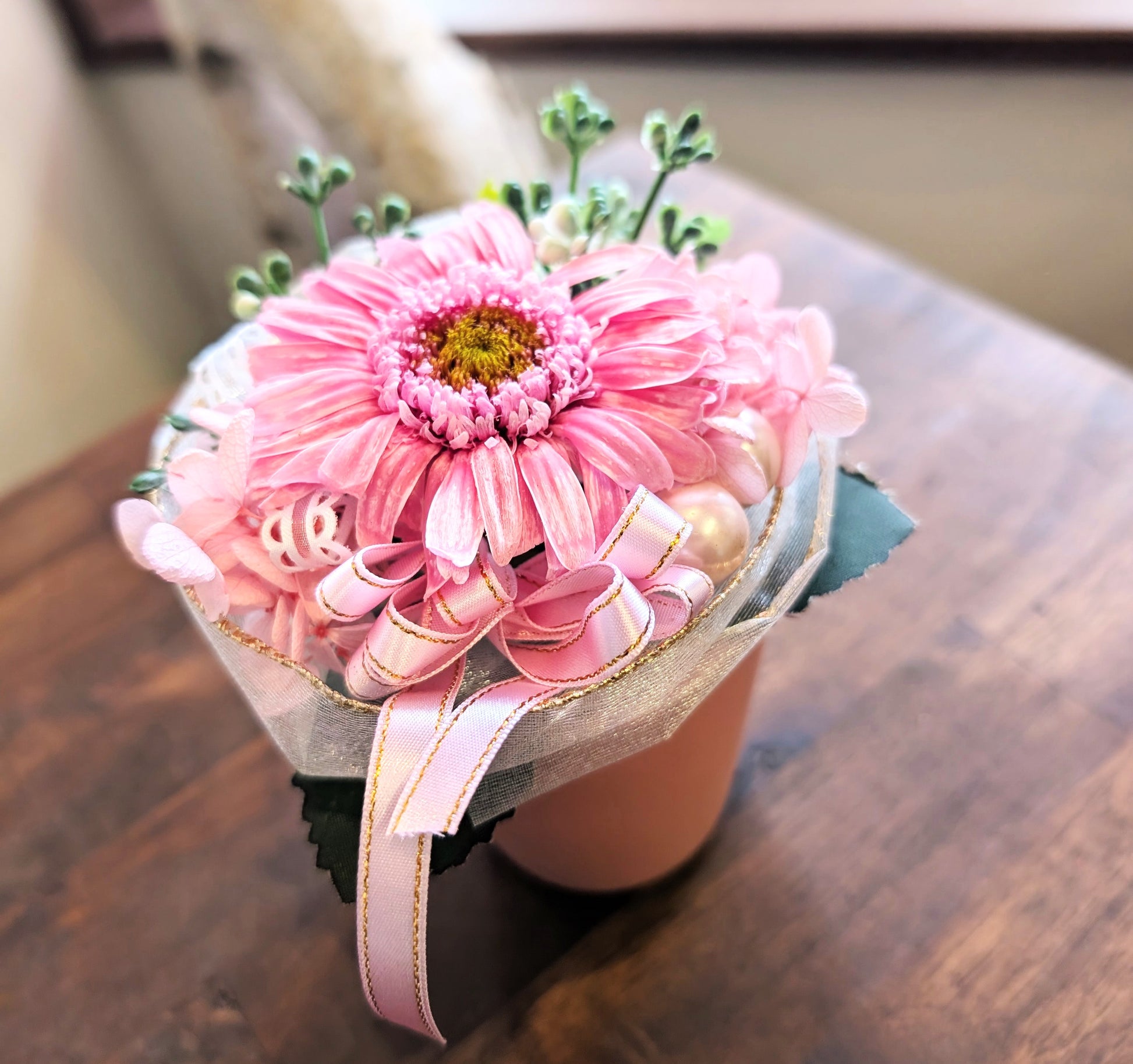 プリザーブドフラワーのピンクのガーベラを3種のリボンとあじさいを入れたアレンジ。さまざまなお祝い事に・・・