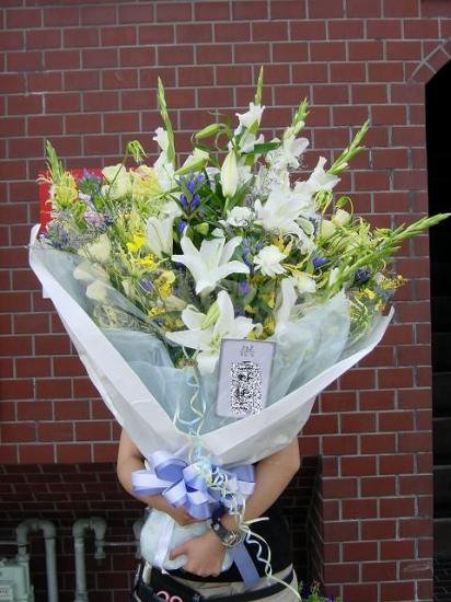 白いユリをメインに 季節のお花を入れたボリュームのある花束です。