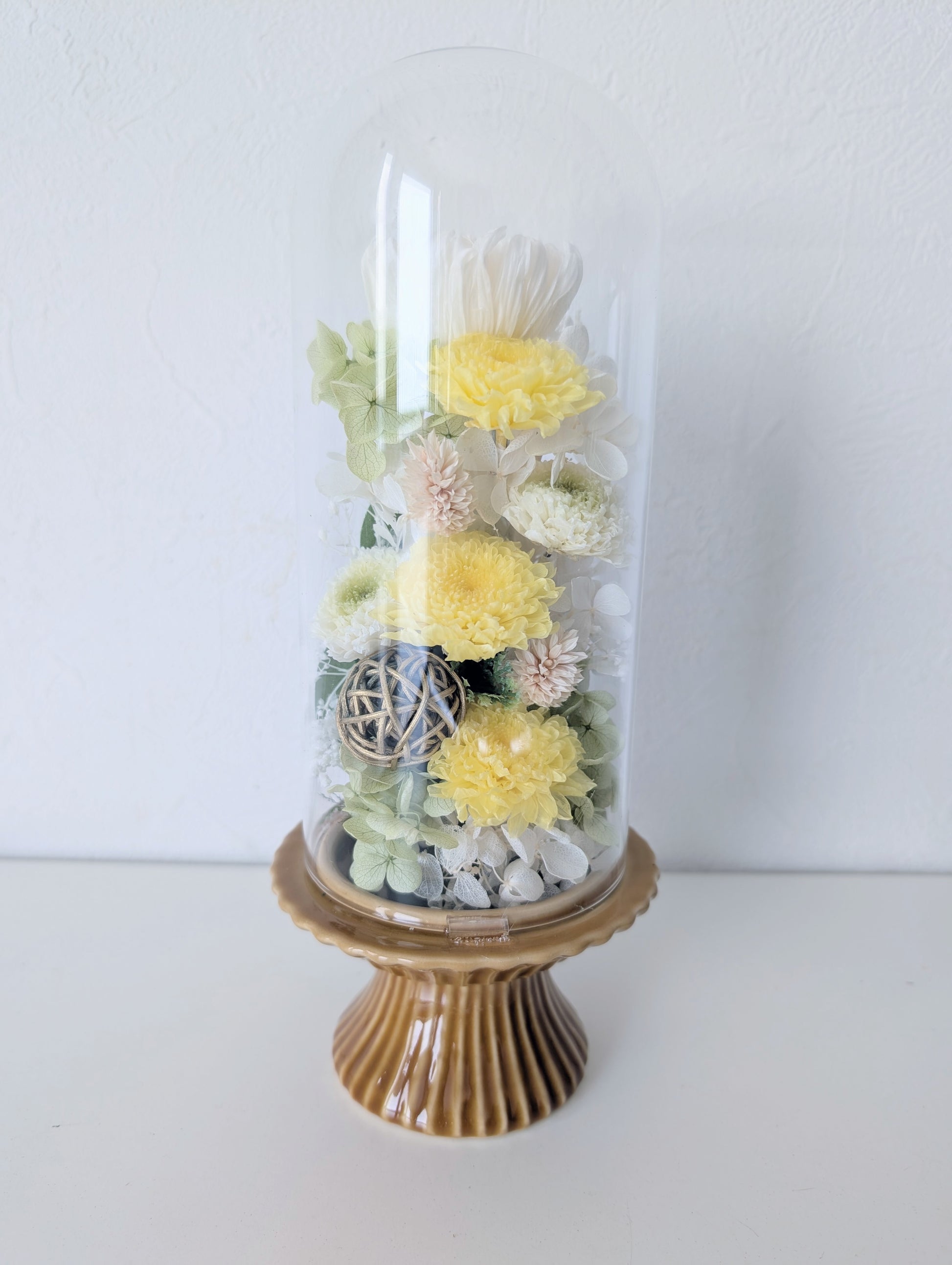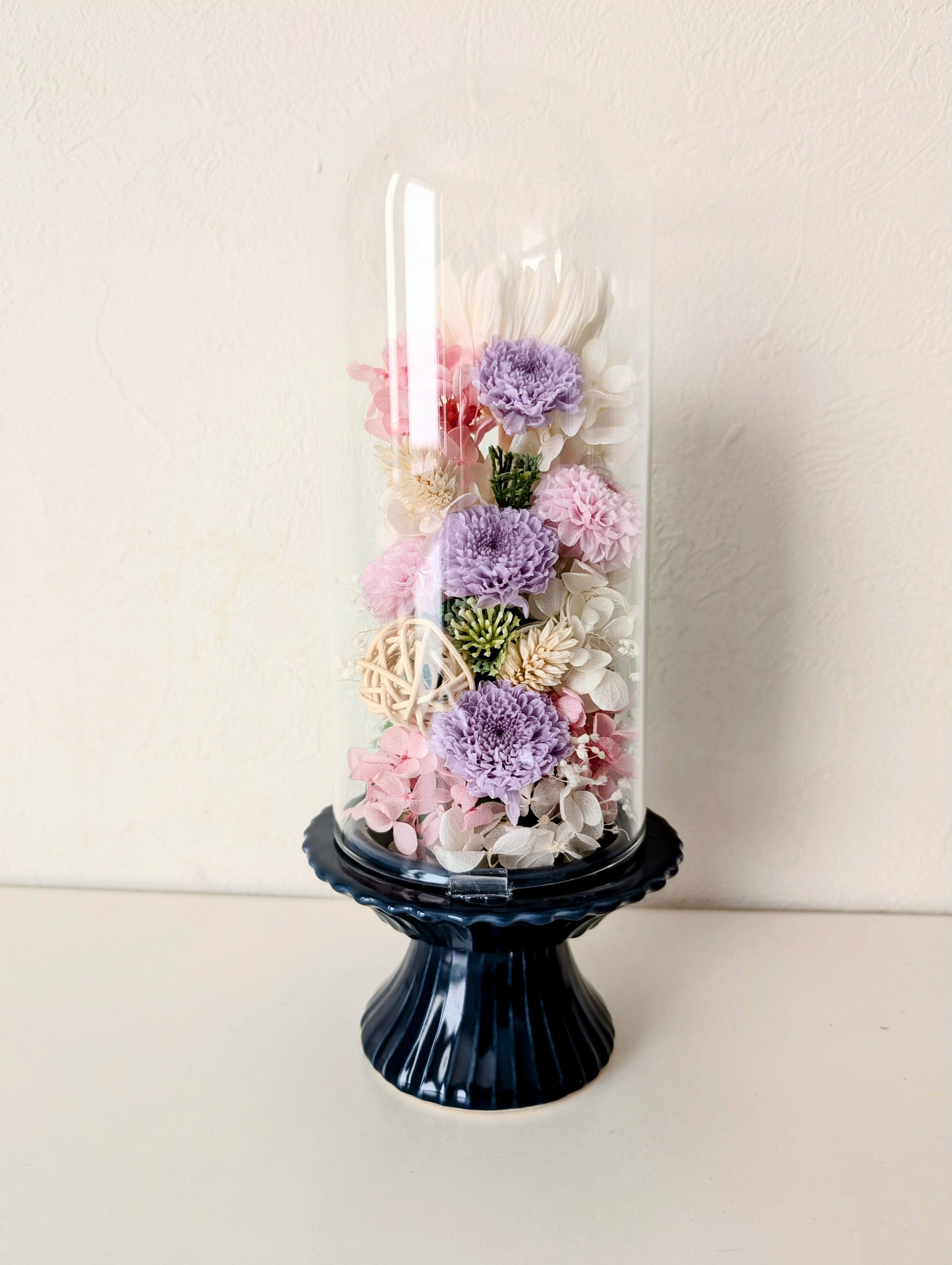 ガラスのドームの中に大菊・スプレーマム・あじさい等をアレンジしました。